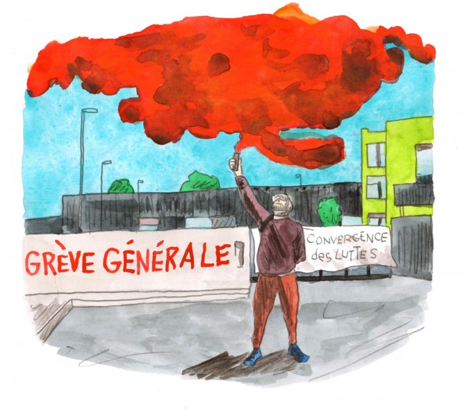 Les tenants du piquet expliquent la suite de leur plan : un journaliste de La Provence est en route, ils vont l’attendre pour faire une action symbolique. Le groupe va se mettre sur la chaussée, sans bloquer le dépôt des bus – « pour rester dans la légalité » – mais en ralentissant la circulation. S’ensuit une demi-heure de joyeux bordel : les sous-traitants sont équipés en fumigène et tous et toutes s’appliquent à donner de la voix devant la caméra de La Provence. Alors que les nouvelles et nouveaux venu·es demandent quels slogans il faut chanter, il y a comme un blanc. « Payez-nous ! » et « Stop au complot… » Une formulation qui fait tiquer certain·es des bloqueur·euses… Mais n’empêche pas le groupe de s’élancer à la rencontre des voitures arrêtées devant le piquet pour expliquer le combat des sous-traitants d’Atalian, puisque la paire de banderoles accrochée aux grilles mettant en cause l’entreprise est difficilement déchiffrable. Puis, avec l’enthousiasme du nombre, les bus sont finalement bloqués.