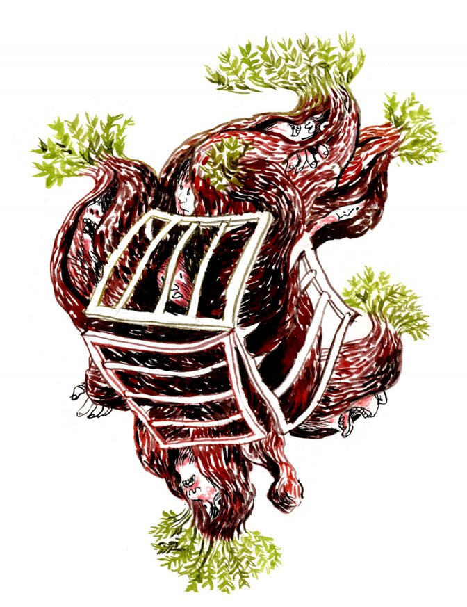 Quelques lacets plus bas, Yanis s’arrête dans un nuage de poussière. On descend et on reprend la récolte sur un autre terrain, plus proche du village. Avec une aiguille courbe, Layla entreprend de coudre solidement les sacs pour les fermer. Ses grandes mains usées sont colorées par les olives qu’elle a triées toute la matinée. Pendant ce temps, Monder*, son neveu, nous rejoint. C’est un minuscule garçon qui n’en fait qu’à sa tête, mais qui est capable de grimper récolter les plus hautes branches avec une redoutable efficacité. Vers 17 heures, la récolte de ce champ est terminée. Nous passons la soirée chez le frère de Yanis. Il nous accueille avec un thé à la sauge dans son salon sobrement décoré. À côté de la porte, la photo d’un jeune martyr. En face, des images d’organisations de la gauche palestinienne et un cadre qui montre un jeune homme souriant. Aïcha, deux ans, trottine vers le portrait. Il s’agit de son cousin, emprisonné dans les geôles israéliennes, on ne sait pas où, ni pourquoi, ni pour combien de temps. Il a 21 ans et c’est la cinquième fois qu’il est jeté en prison. Un jour, l’armée est venue et les soldat·es ont saccagé la maison. Puis ils l’ont embarqué sans donner de motif. La petite fille soulève le cadre qui fait pratiquement sa taille et couvre la vitre de baisers : Omar ! Mon chéri ! Après avoir grimpé sur l’accoudoir du canapé, elle finit par me donner la photographie encadrée en me demandant de l’embrasser aussi, avant de tomber dans les coussins, déclenchant les rires de l’assemblée. Comme le cousin d’Aïcha, environ 40 % des hommes palestiniens passent par les geôles israéliennes2 au cours de leur vie. Un des convives nous explique que les récits de celles et ceux qui en sont sortis ont beaucoup changé depuis le début du génocide. Si les violences physiques et sexuelles existaient déjà auparavant, elles sont devenues systématiques. Un constat que L’ONG israélienne B’tselem fait également : dans son rapport « Welcome to hell » datant d’août 2024, elle décrit le fonctionnement des prisons sionistes comme « un réseau de centres de torture ».