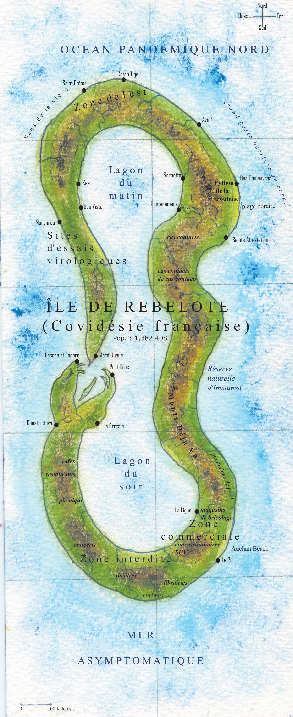 Son approche se veut aussi ouverte que possible. Il dit « tenter de cartographier des choses aussi diverses que des romans californiens, la généalogie d’un club de foot loisir, l’arabe dialectal égyptien, la procrastination… », avec une vision de la carte comme « dispositif de mémoire, porteuse de récits et d’imaginaires ». On a choisi de publier sa belle représentation de L’Île de Rebelote (Covidésie française), consacrée à la saison 2 de la série planétaire Covid. Ceci dit, on aimerait bien ne pas avoir à publier dans quelques mois L’Île de la Re-rebelote. À bon entendeur...